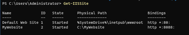 با اجرای دوبارهی Get-IISSite، میتوانید مطمئن شوید سایت در حالت Started یا Stopped قرار دارد.