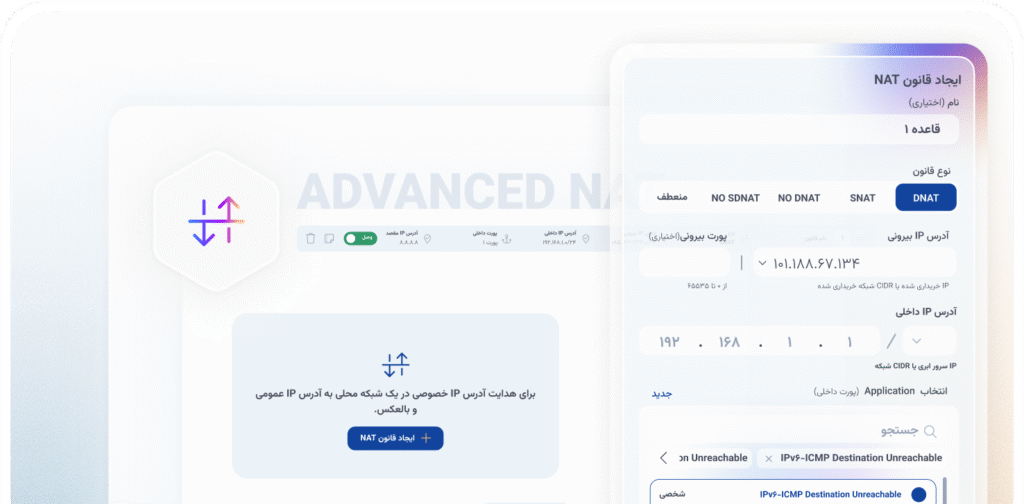 آیا آماده‌اید شبکه سازمان خود را ایمن‌تر و بهینه‌تر مدیریت کنید؟ با سرویس NAT پیشرفته ابر آراد، ترجمه و مدیریت آدرس‌های IP، کنترل ترافیک و افزایش امنیت شبکه را بدون پیچیدگی و با انعطاف کامل تجربه کنید. حالا زمان آن رسیده که با کاهش مصرف منابع، مقابله مؤثر با تهدیدات و مدیریت حرفه‌ای ترافیک، زیرساخت خود را برای رشد و پایداری آماده کنید.